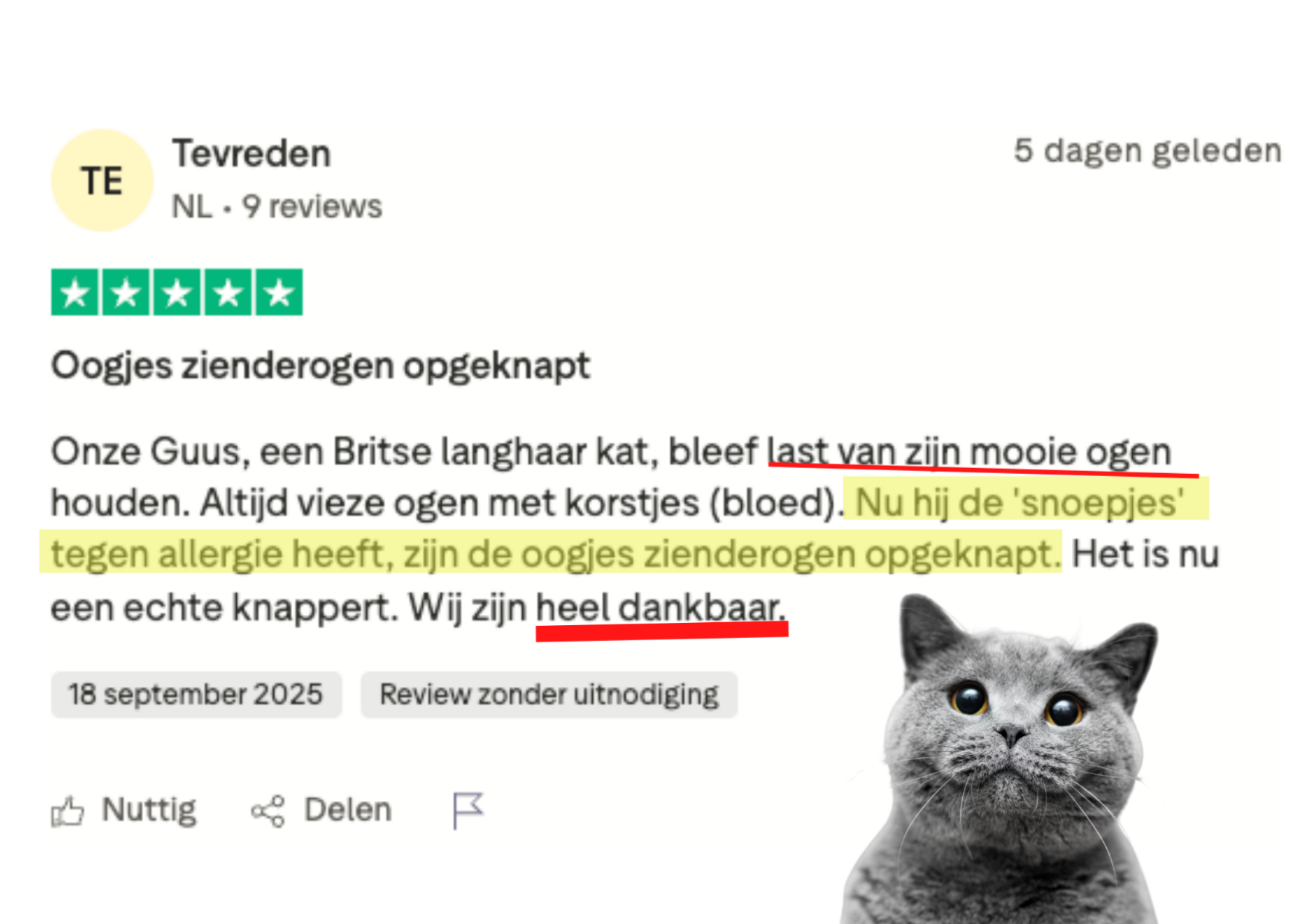 Het is belangrijk om je kat de tijd te geven om zich aan te passen en de natuurlijke ingrediënten hun werk te laten doen. Daarom bieden wij ook een 90-dagen resultaatsgarantie – precies de periode die we aanraden voor een eerlijk oordeel.