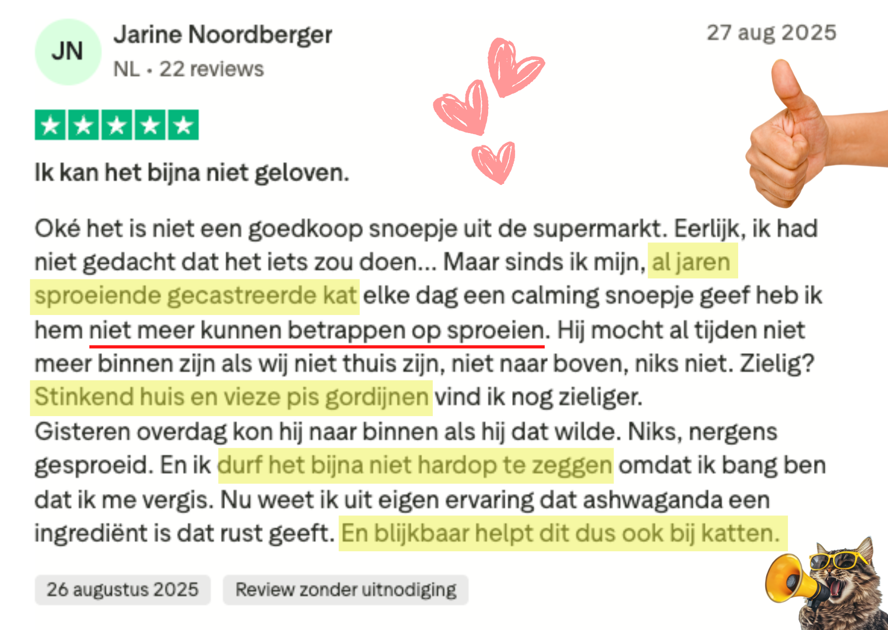 Het is belangrijk om je kat de tijd te geven om zich aan te passen en de natuurlijke ingrediënten hun werk te laten doen. Daarom bieden wij ook een 90-dagen resultaatsgarantie – precies de periode die we aanraden voor een eerlijk oordeel.