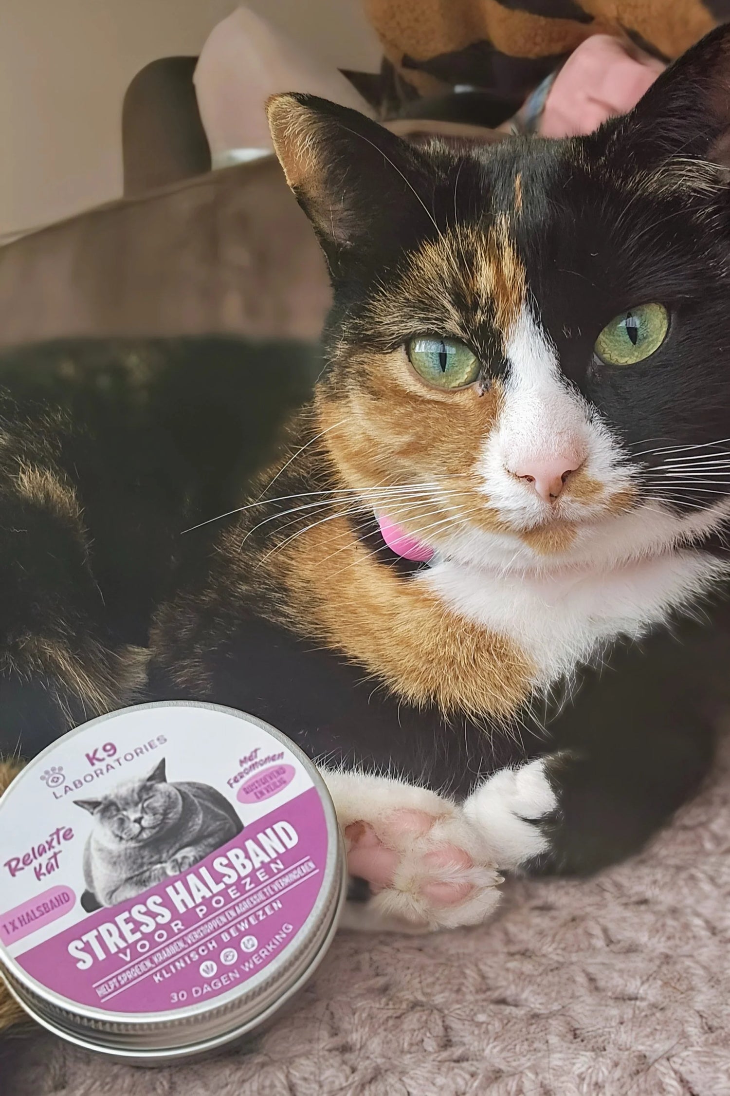 De halsband bevat natuurlijke feromonen en een vleugje lavendel, volledig veilig voor katten.