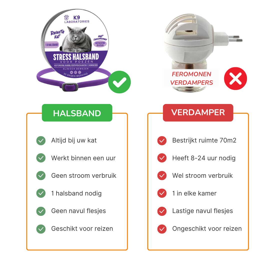 Een diffuser werkt alleen binnenshuis en een spray is tijdelijk, maar met de halsband heeft je kat haar eigen draagbare comfortzone.